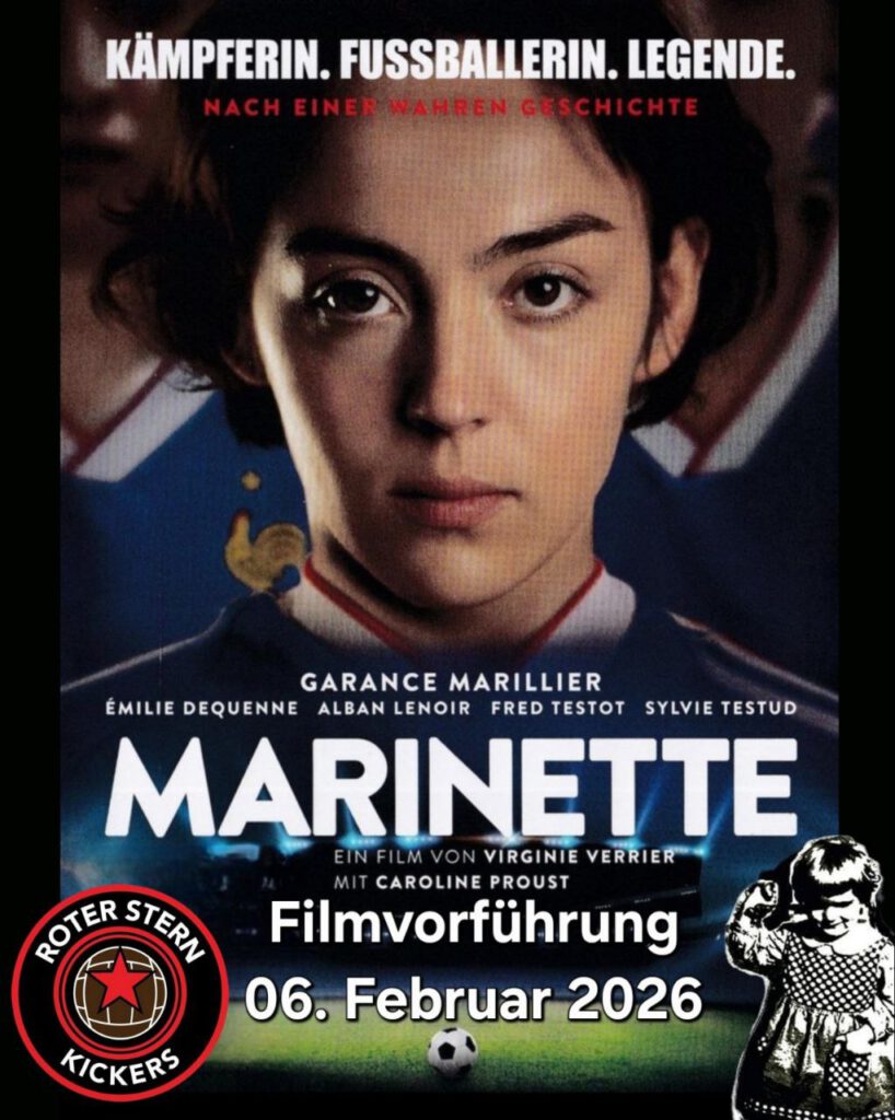 Am 6. Februar 2026 lädt der RSK im Vorfeld des Turniers noch zum Filmabend im B-Movie (Brigittenstraße 5, Hamburg) ein. Gezeigt wird der Spielfilm „MARINETTE – Kämpferin. Fußballerin. Legende.“ (Frankreich 2023, 92 Minuten, deutsche Fassung) von Virginie Verrier, der die bewegende Lebensgeschichte der französischen Fußballpionierin Marinette Pichon erzählt, die für die Sichtbarkeit von Frauen und der LGBTQIA*-Community im Sport eine wichtige Rolle einnahm. Einlass ist ab 19 Uhr, Filmbeginn um 19:30 Uhr, der Eintritt ist frei; im Anschluss klingt der Abend an der Kino-Bar aus. Anmeldungen für den Kinoabend gerne über info@rotersternkickers.net